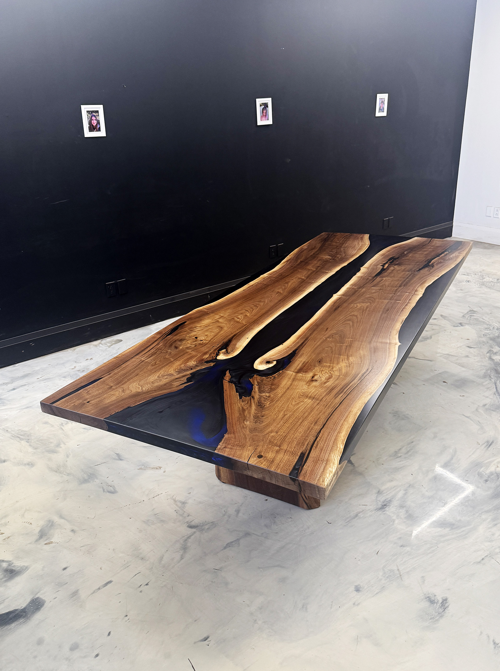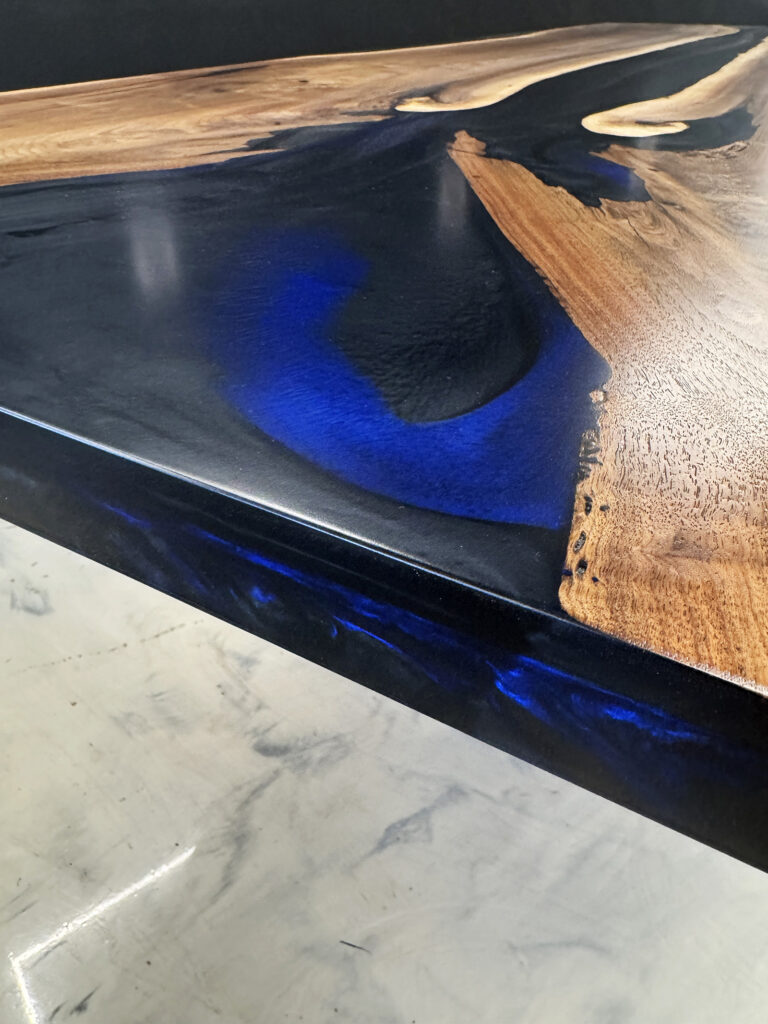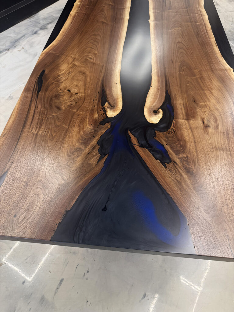 We used 2 beautiful Black Walnut slabs from the same log to create a symmetrical “book-match” design. The epoxy is solid (no transparency) and features subtle dark deep sea blue accents.